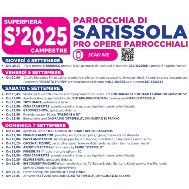 Da giovedì 4 a domenica 7 settembre 2025 si rinnova l'appuntamento con la Superfiera Campestre di Sarissola, manifestazione che anima la Valle Scrivia con gastronomia, giochi, musica, balli e spettacoli.