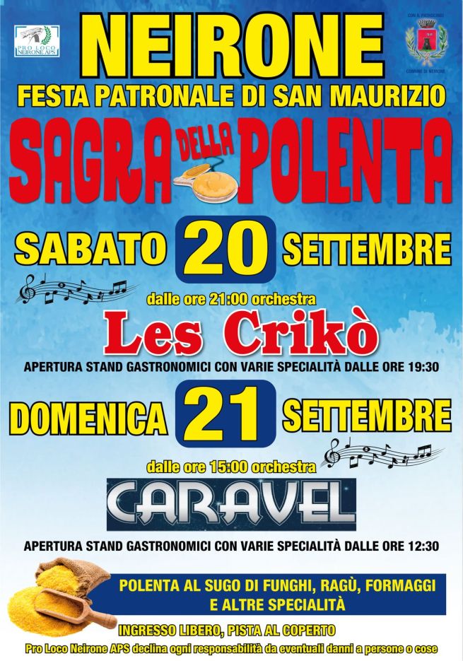 Sabato 20 e domenica 21 settembre 2025 , a Neirone (Val Fontanabuona), torna la Sagra della polenta per la Festa Patronale di San Maurizio. L'evento è organizzato dalla Pro Loco Neirone APS, con due giorni di musica, gastronomia e intrattenimento per grandi e piccini.