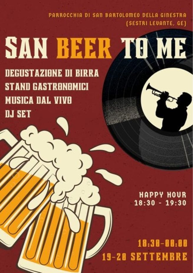 Venerdì 19 e sabato 20 settembre 2025 appuntamento presso la Parrocchia di San Bartolomeo della Ginestra a Sestri Levante per l'vento San Beer to Me, festa della birra con degustazioni, stand gastronomici, musica dal vivo e dj set. Si parte alle 18.30 con l'happy hour fino alle 19.30, si prosegue poi fino a mezzanotte. Di seguito la locandina dell'evento.