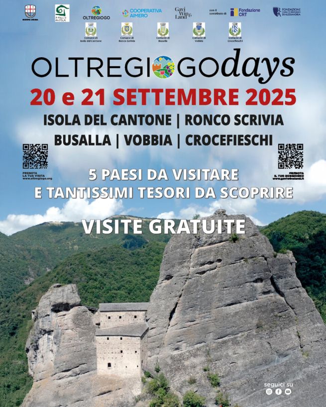 Cinque Comuni e molti luoghi da scoprire: sabato 20 e domenica 21 settembre 2025 si rinnova l'appuntamento con gli Oltregiogo Days. Un intero weekend in cui i borghi di Isola del Cantone, Ronco Scrivia, Busalla, Vobbia e Crocefieschi aprono i loro tesori a tutti i visitatori.
