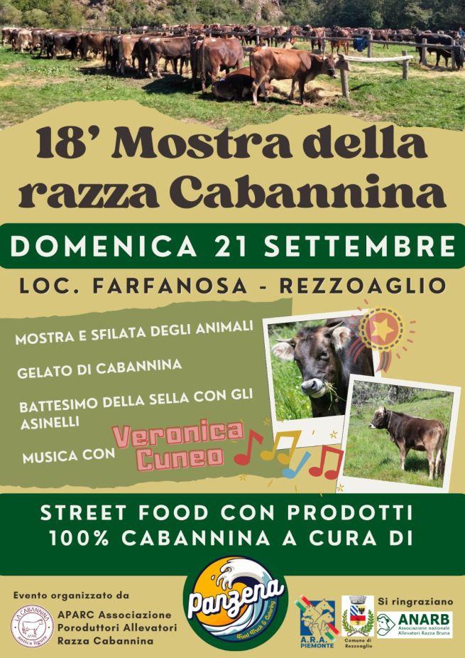 Domenica 21 settembre 2025, appuntamento con la 18esima Mostra della Razza Cabannina presso la località attrezzata di Farfanosa (comune di Rezzoaglio). Si tratta della tradizionale mostra zootecnica a cura dell'Aparc - Associazione Produttori Allevatori Razza Cabannina con festa campestre: dalla mattina mostra e sfilata degli animali, battesimo della sella con gli asinelli, musica con Veronica Cuneo, gelato e street food con prodotti 100% Cabannina. Di seguito la locandina dell'evento.