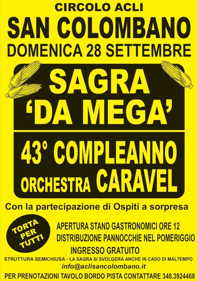 Domenica 28 settembre 2025 appuntamento con la Sagra della Mega a San Colombano Certenoli, al Circolo Acli in via Norero 27. Tradizionale menù a base di mais e, nel pomeriggio, si festeggia con l'orchestra Caravel il 43esimo compleanno della band in compagnia di ospiti speciali a sorpresa e la torta.