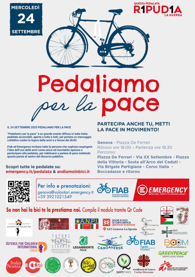 Mercoledì 24 settembre 2025, Fiab ed Emergency organizzano la Pedalata per la Pace a Genova. Ci si ritrova in piazza De Ferrari, dove da molti anni si svolge l'Ora della Pace, alle ore 18. È previsto un percorso facile e pianeggiante, interamente su corsie o piste ciclabili: piazza De Ferrari - via XX Settembre - piazza della Vittoria - sosta all'Arco dei Caduti - viale Brigate Partigiane - corso Italia - Boccadasse e ritorno.