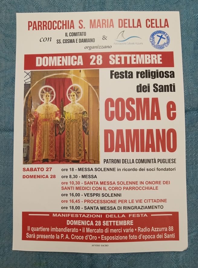 I Santi Cosma e Damiano, ricordati dalla Chiesa cattolica il 26 settembre, erano di origine araba e dedicarono la loro vita all’attività medica, svolta gratuitamente. Per questo sono venerati come ''Santi medici'' e definiti anche ''santi senza argento e non mercenari'', simboli di altruismo e dedizione al prossimo. Martirizzati sotto l'impero di Diocleziano, continuano a essere oggetto di profonda devozione. A Sampierdarena il loro culto è particolarmente vivo: all'ingresso della Chiesa della Cella si trovano due statue lignee realizzate intorno al 1960, custodite con cura e meta di continua venerazione, soprattutto da parte della comunità pugliese.