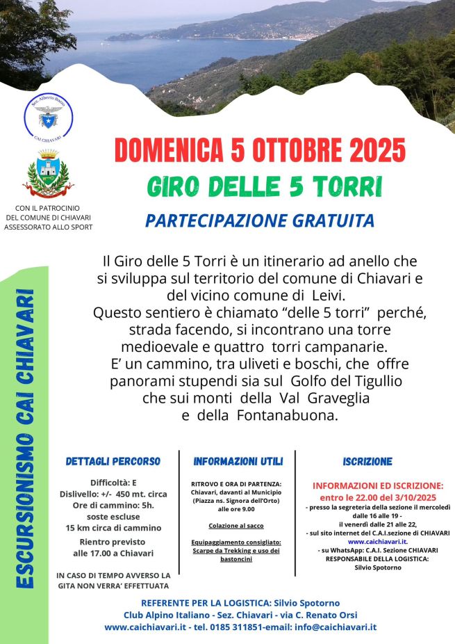 Nuovo appuntamento domenica 5 ottobre 2025 alla scoperta del territorio, con l’escursione gratuita Giro delle 5 Torri promossa dal Club Alpino Italiano - sezione di Chiavari con il patrocinio del Comune di Chiavari - Assessorato allo Sport. Un'occasione per vivere un’esperienza immersi nella natura e nella storia locale. L'itinerario, ad anello, si sviluppa tra i comuni di Chiavari e Leivi e prende il nome dalle cinque torri che si incontrano lungo il percorso: una torre medievale e quattro torri campanarie. Si tratta di un cammino suggestivo tra uliveti e boschi, capace di offrire scorci panoramici unici sia sul Golfo del Tigullio sia sui monti della Val Graveglia e della Fontanabuona.