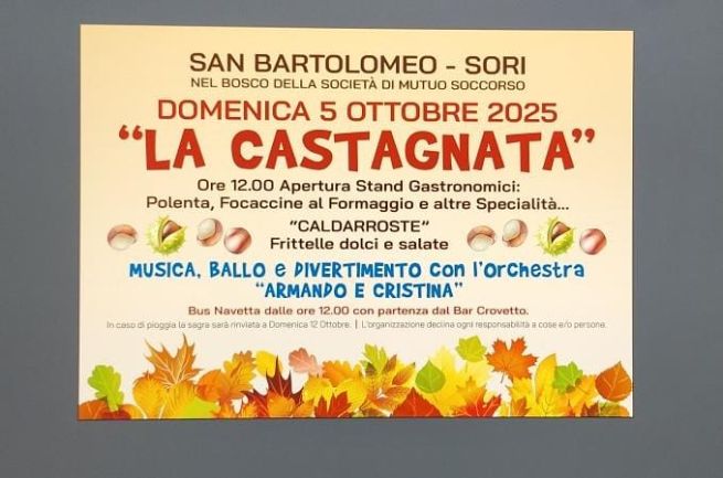 Torna la Castagnata a San Bartolomeo di Sori, nel bosco della Società di Mutuo Soccorso. Appuntamento domenica 5 ottobre 2025, dalle ore 12, quando aprono gli stand gastronomici e si possono gustare polenta, focaccine al formaggio e altre specialità. Non mancano le caldarroste e le frittelle dolci e salate.