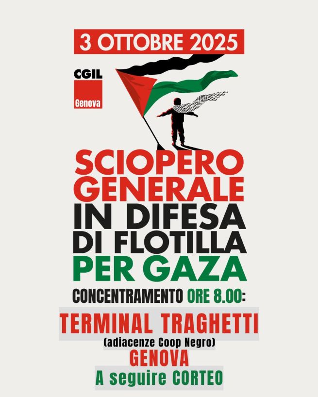 La Cgil e l'Unione Sindacale di Base (Usb) hanno indetto, per venerdì 3 ottobre 2025, uno sciopero generale in protesta contro l'abbordaggio israeliano delle barche della Global Sumud Flotilla, e a favore dei valori costituzionali e di Gaza. La Cgil lo ha definito «un attentato diretto all’incolumità e alla sicurezza di lavoratrici e lavoratori, volontarie e volontari imbarcati». L'Usb ha parlato di «un'aggressione che calpesta i valori democratici e la dignità umana». Nella città di Genova, la Cgil dà appuntamento alle ore 8 presso il Terminal Traghetti (adiacenze Coop Negro), con corteo a seguire (verso il centro, ma non si conosce ancora il percorso nel dettaglio). ''Scendiamo tutte e tutti in piazza, basta indifferenza!'' scrivono gli organizzatori.