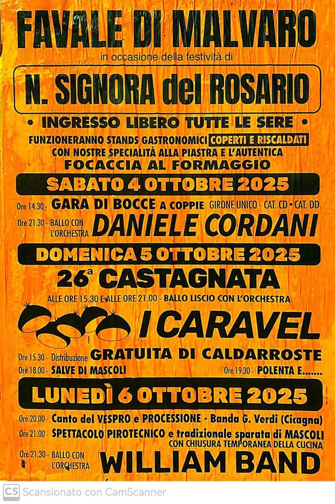 A Favale di Malvaro, ai piedi del Passo della Scoglina, da sabato 4 a lunedì 6 ottobre 2025, sono previsti eventi, gastronomia e musica in occasione della festività di Nostra Signora del Rosario. Questo il programma delle tre giornate, con stand gastronomici coperti e riscaldati con specialità alla piastra, focaccia al formaggio tutte le sere e Castagnata nella giornata di domenica (ingresso libero).