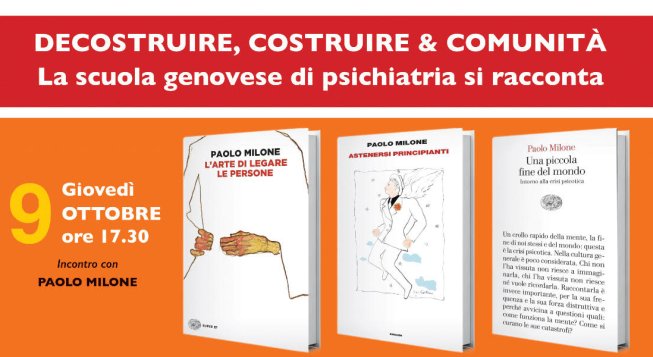 Giovedì 9 ottobre 2025, alle ore 17.30, presso la Libreria San Paolo - piazza Matteotti 31-33 r - si tiene il primo appuntamento della rassegna Decostruire, Costruire & Comunità. La scuola genovese di psichiatria si racconta. Protagonista lo psichiatra Paolo Milone, autore dei libri L'arte di legare le persone, Astenersi principianti e Una piccola fine del mondo. Intorno alla crisi psicotica, tutti editi da Einaudi. Ingresso libero e gratuito.