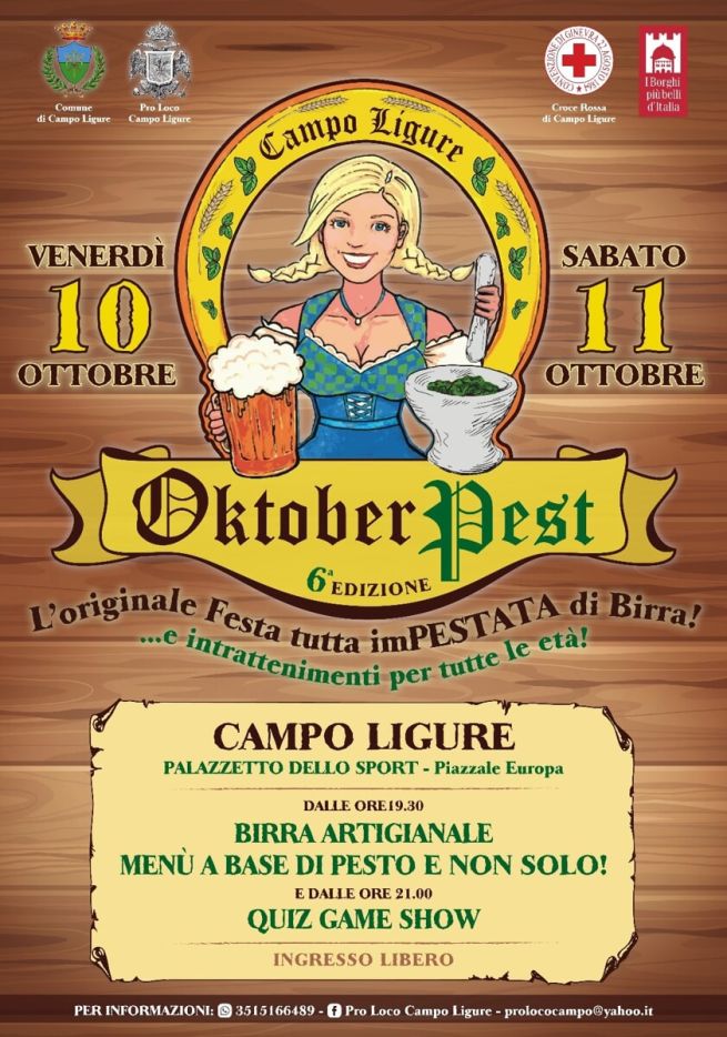 Si rinnova l'appuntamento con l'OktoberPest a Campo Ligure, nel doppio appuntamento di venerdì 10 e sabato 11 ottobre 2025. Sesta edizione per la festa del pesto e della birra, che approda al Palazzetto dello Sport per celebrare il mix tra un menù a base di pesto e birre artigianali di qualità.
