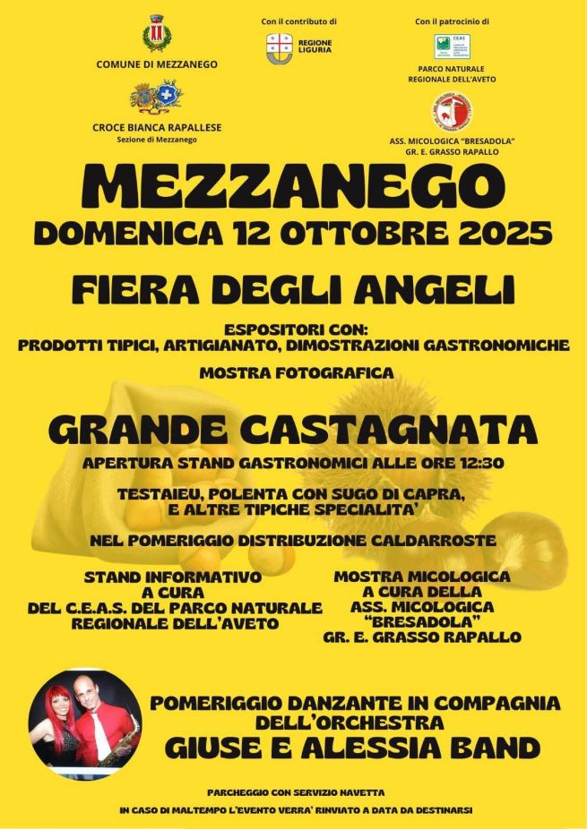 Durante la giornata ci sono espositori di prodotti tipici e artigianato, dimostrazioni gastronomiche, mostra fotografica, stand gastronomici con specialità locali (apertura dalle ore 12.30) e la Grande Castagnata con caldarroste nel pomeriggio. Si possono gustare testaieu, polenta con sugo di capra e non solo. La Fiera degli Angeli a Mezzanego è arricchita da una mostra micologica e da un pomeriggio danzante con la Giuse e Alessia Band, per ritrovare insieme il gusto delle tradizioni di un tempo.