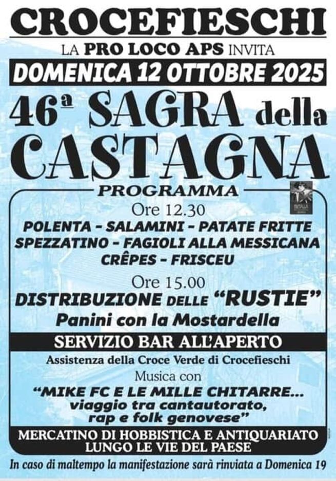 Domenica 12 ottobre 2025, a Crocefieschi, appuntamento con la 46esima Sagra della Castagna, inserito tra gli Eventi Autentici Liguri 2025. Si parte alle ore 12.30 con polenta, salamini, patate fritte, spezzatino, frisceu, fagioli alla messicana e crêpes. Poi, dalle ore 15, distribuzione di rustie e panini con la mostardella. Servizio bar garantito tutto il giorno grazie alla Croce Verde di Crocefieschi che presenzia per tutta la durata della manifestazione.
