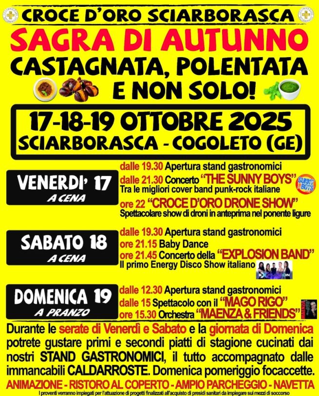Torna uno degli eventi più amati del Ponente ligure: la Sagra di Autunno - Castagnata, Polentata e non solo!, organizzata dalla Croce d’Oro Sciarborasca. L'appuntamento è per venerdì 17, sabato 18 e domenica 19 ottobre 2025 presso il Centro Civico P. Delussu a Sciarborasca, nel comune di Cogoleto.