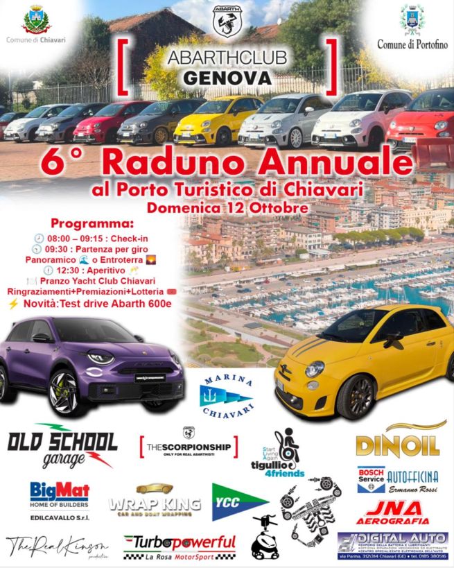 Il Comune di Chiavari ospita il sesto Raduno Abarth, un evento ufficiale dedicato agli appassionati del celebre marchio automobilistico. Domenica 12 ottobre 2025, il Porto Turistico si trasforma in un palcoscenico dinamico per celebrare la tradizione, lo stile e le prestazioni delle vetture dello Scorpione.