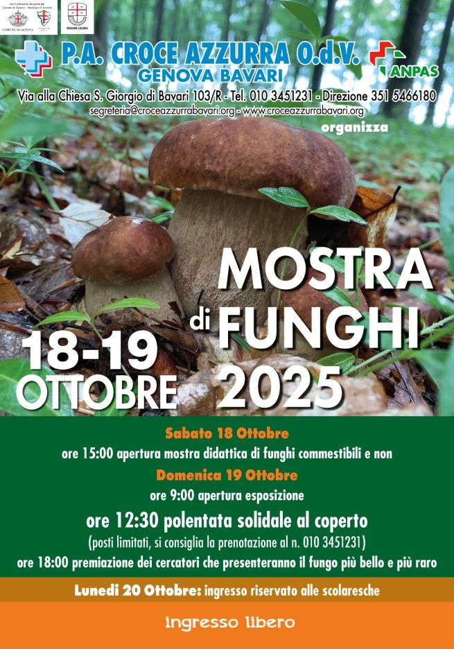 A Bavari, presso la P.A. Croce Azzurra Bavari (via alla Chiesa di San Giorgio 103/R), c'è la mostra dei funghi con apertura dalle ore 15 sabato e alle ore 9 la domenica. Presenti funghi commestibili e non. Inoltre, domenica 19 ottobre, alle ore 12.30 polentata solidale al coperto (posti limitati, si consiglia la prenotazione al numero 010 3451231). Poi, alle ore 18, la premiazione dei cercatori che presentano il 'fungo più bello' e il 'fungo più raro'. L'ingresso è libero.