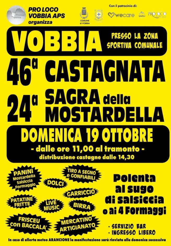 L'evento si svolge presso l'area sportiva di Vobbia a partire dalle ore 11 fino al tramonto. Presente intrattenimento con musica, tiro a segno, gonfiabili, garriccio e mercatini di artigianato. Il menù è ricco: si possono gustare polenta al sugo di salsiccia o ai 4 formaggi, panini con mostardella, salsiccia e formaggio, birra, patatine fritte, frisceu con baccalà, torte e servizio bar. Distribuzione di castagne a partire dalle ore 14.30. In caso di allerta arancione, la sagra è rinviata alla domenica successiva. Di seguito la locandina dell'evento.
