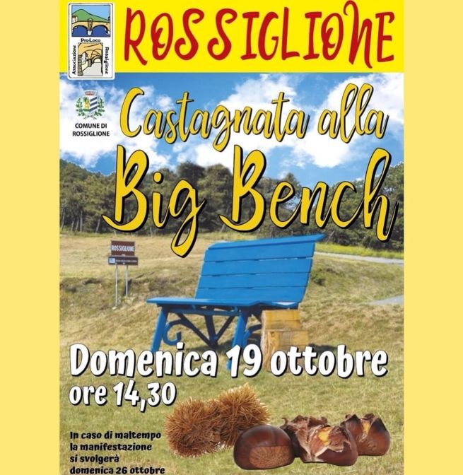 Pro Loco Rossiglione e Comune di Rossiglione organizzano la Castagnata alla Big Bench di Rossiglione, in programma nella giornata domenica 19 ottobre 2025 alle ore 14.30. Un pomeriggio d'autunno tra natura, panorami e profumo di castagne. Si tratta anche di una giornata di festa per grandi e piccini. In caso di maltempo, l'evento è rinviato a domenica 26 ottobre 2025. Di seguito la locandina dell'evento.