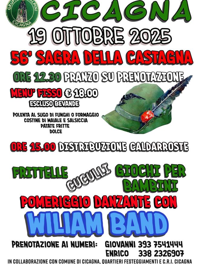 Domenica 19 ottobre 2025 torna la Sagra della Castagna a Cicagna (giunta alla 56esima edizione), per una giornata di festa in Val Fontanabuona. Alle ore 12.30 pranzo su prenotazione con polenta al sugo di funghi o formaggio, costine di maiale e salsiccia, patatine fritte e dolce (costo di 18 euro, per prenotare chiamare Giovanni 393 7541444 o Enrico 338 2326907).