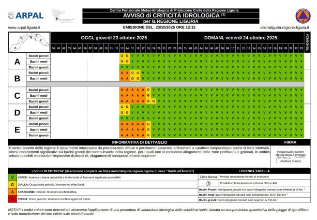 - Sul levante (zona C), l'allerta arancione chiude alle 18 di giovedì 23 ottobre, a seguire allerta gialla fino alle 19, sui bacini grandi fino alle 20;