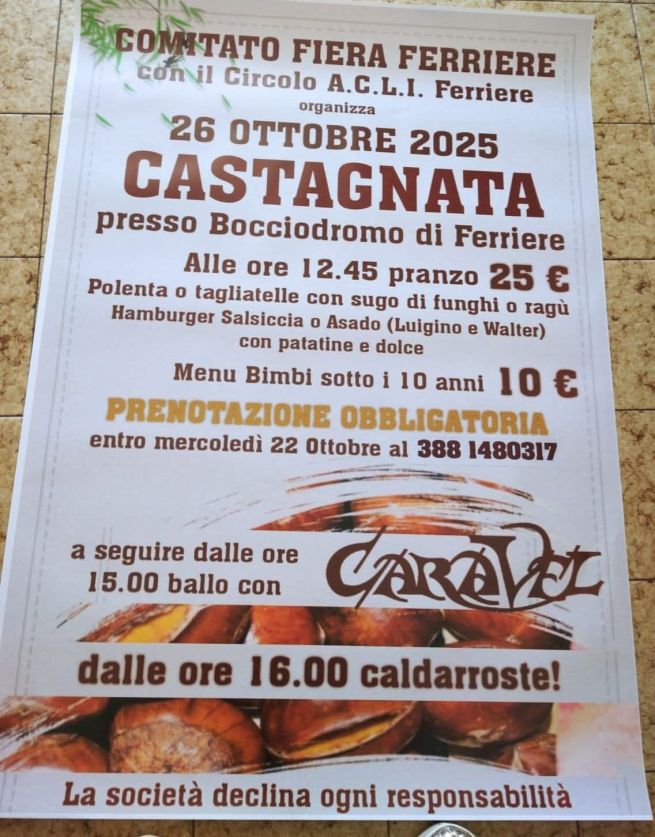 Il Comitato Fiera Ferriere, con il Circolo Acli Ferriere, organizza per la giornata di domenica 26 ottobre 2025 la Castagnata presso il Bocciodromo di Ferriere (Lumarzo). Alle ore 12.45 pranzo a 25 euro con polenta o tagliatelle con sugo di funghi o ragù, hamburger salsiccia o asado (Luigino e Walter) con patatine e dolce. Menù bimbi sotto i 10 anni 10 euro (prenotazione obbligatoria entro il 22 ottobre al numero 388 1480317). A seguire, dalle ore 15, ballo con l'Orchestra Caravel, mentre alle 16 c'è la distribuzione di caldarroste.