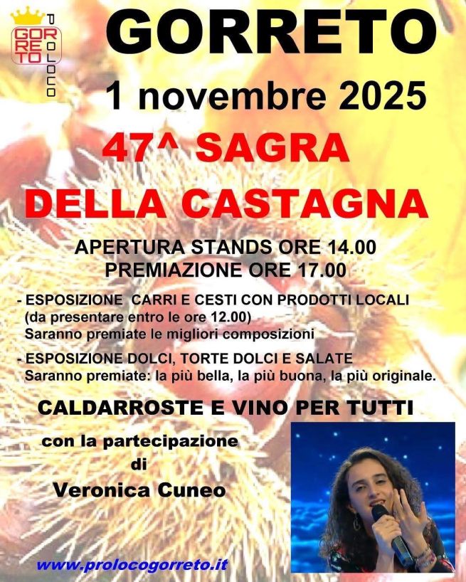 In programma anche l'esposizione di dolci, torte dolci e salate con premiazione della più bella, della più buona e della più originale. Caldarroste e vino per tutti con la partecipazione musicale di Veronica Cuneo. L'evento è organizzato dalla Pro Loco Gorreto. Per info e aggiornamenti, anche in base alle condizioni meteo, consultare la pagina facebook Consorzio Val Trebbia.