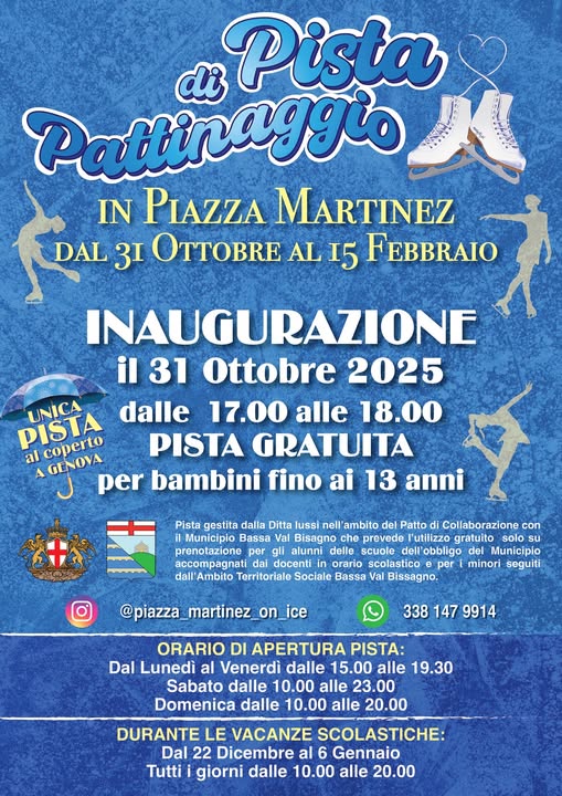 La pista è gestita dalla Ditta Iussi nell'ambito del patto di collaborazione con il Municipio Bassa Val Bisagno, che prevede l'utilizzo gratuito solo su prenotazione per gli alunni delle Scuole dell'obbligo del Municipio accompagnati da docenti in orario scolastico e per i minori seguiti dall'Ambito Territoriale Sociale Bassa Val Bisagno. Info e aggiornamenti: pagina Instagram piazza_martinez_on_ice o 338 1479914 (whatsapp). Di seguito la locandina.
