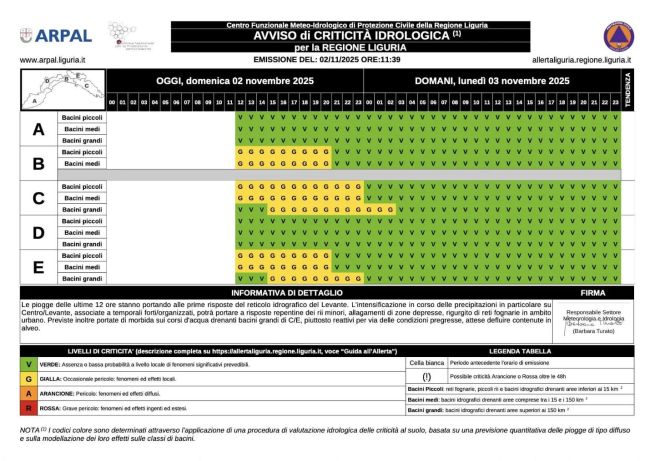 Ancora maltempo a Genova e in Liguria, con un weekend di Ognissanti dal sapore inglese. Arpal ha emesso allerta meteo gialla per temporali sul centro levante (zone B, C ed E) tra domenica 2 e lunedì 3 novembre 2025, aggiornata con i seguenti orari e modalità: