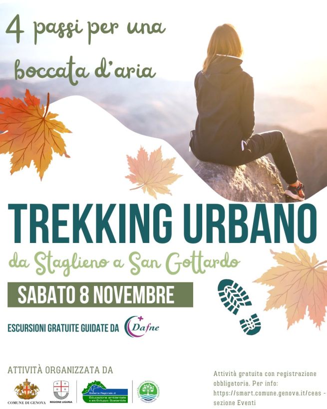 Sabato 8 novembre 2025 è in programma il trekking urbano da Staglieno a San Gottardo. Escursione gratuita a cura di Dafne. Di seguito la locandina con le informazioni per prenotare l'attività.