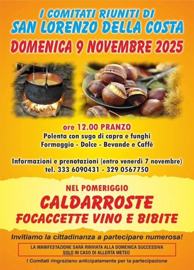 I comitati riuniti di San Lorenzo della Costa (Santa Margherita Ligure) organizzano pranzo e castagnata nella giornata di domenica 9 novembre 2025. A partire dalle ore 12 si può gustare un menù autunnale con polenta con sugo di capra o funghi, formaggio, dolce, bevande e caffè; si prosegue nel pomeriggio con caldarroste, focaccette, vino e bibite. Info e prenotazioni al 333 6090431 o 329 0567750 (entro il 7 novembre). La manifestazione viene rinviata soltanto in caso di allerta meteo. Di seguito la locandina.