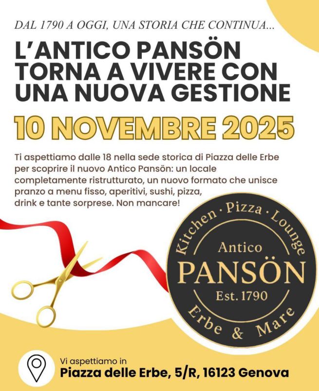 Nuova attività nel centro storico di Genova. Lo storico ristorante Panson in piazza delle Erbe 5/R, un'osteria con albergo autorizzata sin dal 1790, ha riaperto il 28 ottobre scorso e festeggia l'inaugurazione ufficiale lunedì 10 novembre 2025, a partire dalle ore 18.