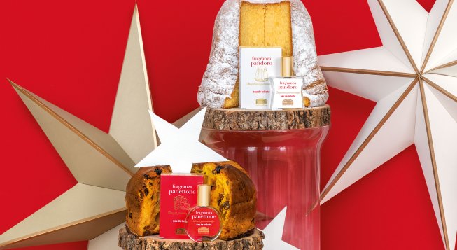 Partiamo dal Panettone, con note di apertura zuccherine di cedro candito, arancia dolce e scorzette di limone, che si fondono a quelle più alcoliche del Rum. Il cuore è voluttuoso, con sentori di crema pasticcera, cannella e spezie, mentre il fondo si chiude con vaniglia nera e zucchero integrale. Il tutto irresistibilmente avvolgente, con golose nuance gourmand. Non solo eau de toilette per la linea Panettone, ma anche l'olio profumato, il Cofanetto Mani con saponetta vegetale e crema, il sapone liquido, il Cofanetto Labbra con maschera scrub levigante e balsamo rimpolpante, senza dimenticare le fragranze per ambiente con bastoncini (in varie dimensioni).