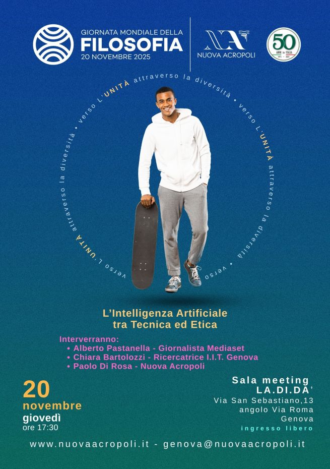 Giovedì 20 novembre 2025, alle ore 17.30, in occasione della "Giornata Mondiale della Filosofia", l'Associazione Nuova Acropoli Genova organizza un incontro a ingresso libero sul tema: L'intelligenza Artificiale, tra tecnica ed etica. Presso Ladidà Italian Brasserie & Club intervengono: