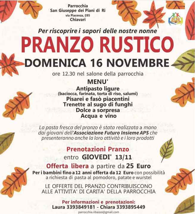 La Parrocchia di San Giuseppe dei Piani di Ri a Chiavari invita a riscoprire i sapori genuini delle nostre nonne. Un'occasione anche per impegnarsi per progetti sociali. Appuntamento domenica 16 novembre 2025, alle 12.30 nel Salone della Parrocchia di San Giuseppe dei Piani di Ri in via Piacenza, 285.