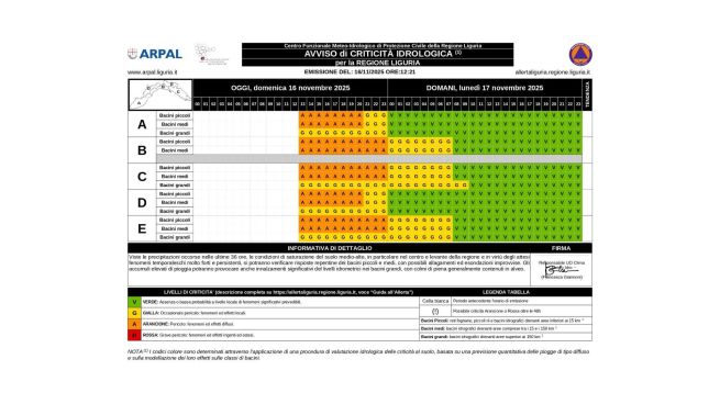 Nella notte fra sabato 15 e domenica 16 novembre 2025, una tregua più significativa a ponente, mentre dalla mattina di domenica 16 novembre 2025 inizia la seconda fase. Alla luce di quanto si è già verificato e delle uscite modellistiche per le prossime ore, che confermano tanta umidità a tutti i livelli in atmosfera ma uno scarso accordo sulle localizzazioni dei fenomeni più intensi, l'allerta meteo è stata così aggiornata: