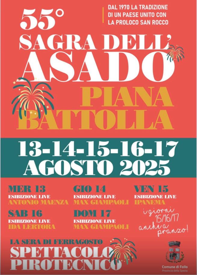 Da mercoledì 13 a domenica 17 agosto 2025, la comunità di Piana Battolla, nel Comune di Follo in bassa Val di Vara, accoglie visitatori da tutta la provincia della Spezia - e non solo - per la Sagra dell’Asado, giunta quest'anno alla sua 55esima edizione. L'evento gastronomico è nato nel 1970 grazie all'impegno della Pro Loco San Rocco, diventando un simbolo di convivialità e identità locale. Protagonista di queste giornate è l'asado, preparato secondo la ricetta tradizionale, accompagnato da piatti tipici che esaltano i sapori autentici della cucina del territorio.