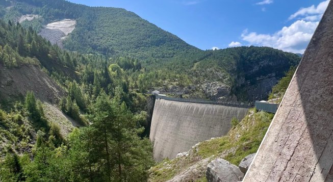 Proprio mentre si cammina sul coronamento della diga ci si può rendere conto della magnitudo della frana che ha coperto di terra e detriti il bacino artificiale formato a seguito della costruzione di questa opera in cemento armato, costruita su un progetto dell'ingenere Carlo Semenza a partire dal 1958 per conto della SADE, Società Adriatica Di Elettricità. L'Italia era appena uscita dalla Seconda Guerra Mondiale e il settore industriale aveva bisogno di un'enorme spinta per ricostruire un paese particamente distrutto. Tuttavia, la foga della ripresa, non tenne conto del fatto che il Monte Toc presentava da subito caratteristiche inadatte ad ospitare questa opera gigantesca, perché da sempre soggetto a frane e smottamenti, dapprima millimetrici, che poi però assunsero una potenza ancora maggiore di una bomba atomica.