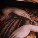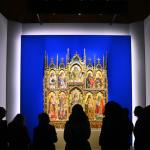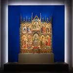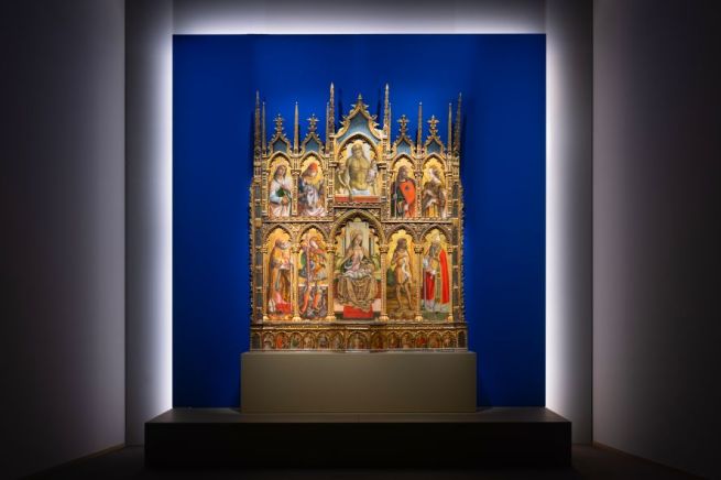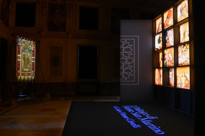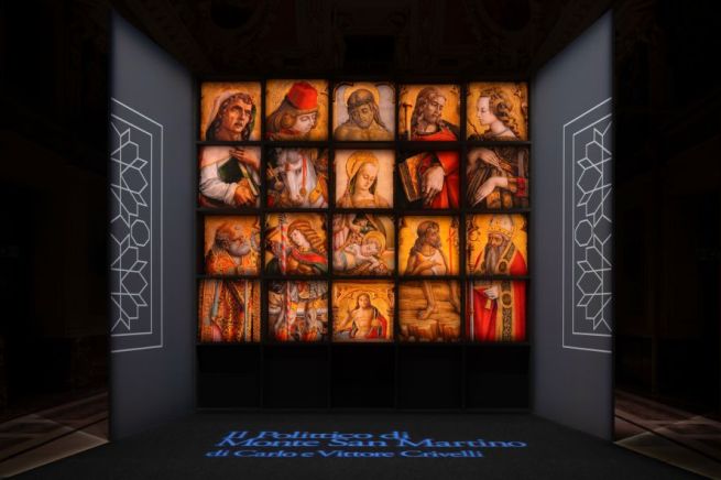 L’allestimento scenografico è ideato dall’architetto Corrado Anselmi e prevede una vera e propria macchina visiva posta al centro della Sala Alessi, pensata come un elemento autonomo rispetto all’ambiente che la ospita. Questa scelta consente una fruizione dinamica e circolare, offrendo al pubblico due momenti distinti di incontro con l’opera. In un primo percorso, all’interno di uno spazio volutamente semibuio, il visitatore è accolto da una grande struttura espositiva che si apre come una libreria luminosa: una sequenza di immagini ad alta definizione dei dettagli del polittico dei Crivelli, che si accendono progressivamente, guidando lo sguardo attraverso i principali temi iconografici e storici. È un’esperienza immersiva che non mostra l’opera nella sua totalità, ma ne rivela la finezza dei particolari, invitando a una visione più lenta e consapevole. L’intento è quello di educare lo sguardo, favorendo una comprensione profonda del linguaggio pittorico dei Crivelli, in cui ogni dettaglio assume valore narrativo e simbolico. Solo al termine di questo percorso, il pubblico giunge davanti al polittico nella sua integrità, collocato in una grande nicchia di luce diffusa che evoca le proporzioni e l’atmosfera della cappella originaria di Monte San Martino. La visione d’insieme dell’opera, dopo l’esperienza analitica dei singoli dettagli, diventa così un momento di sintesi e di emozione: un ritorno all’unità dopo l’osservazione, un modo per restituire a ciascun visitatore un rapporto personale, consapevole e rinnovato con questo capolavoro.