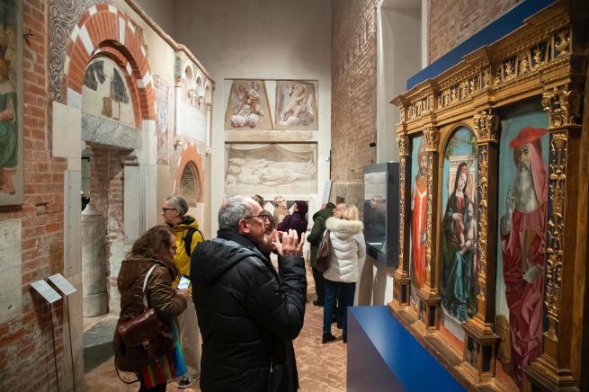 Più nel dettaglio, dall’area accoglienza i visitatori accedono alla sala multimediale, immaginata come luogo di racconto e di riflessione, integrando tecnologia e narrazione spirituale. Entrando nella sala, la parete centrale ospita un video - realizzato da 3D Produzioni con la regia di Giovanni Piscaglia e l'allestimento tecnico a cura di Sigma Vision - dedicato alla straordinaria vita di Ambrogio, che viene rappresentata nelle altre pareti anche attraverso il ciclo degli Oculi della Memoria, sette tavole a tempera su legno, realizzate dallo stesso Amato, che evocano altrettanti momenti centrali della storia personale del Santo Patrono. Un’opera che si allontana dalla narrazione didascalica per diventare un invito alla riflessione, alla scoperta e alla contemplazione. Il percorso conduce a seguire all’aula didattica, pensata come uno spazio vitale dedicato alla trasmissione dei saperi e delle tecniche artigianali, con un lungo tavolo centrale componibile dedicato a workshop e laboratori collettivi, fino ad arrivare all’antico Oratorio della Passione, meravigliosa sala affrescata ora dedicata a presentazioni e incontri.