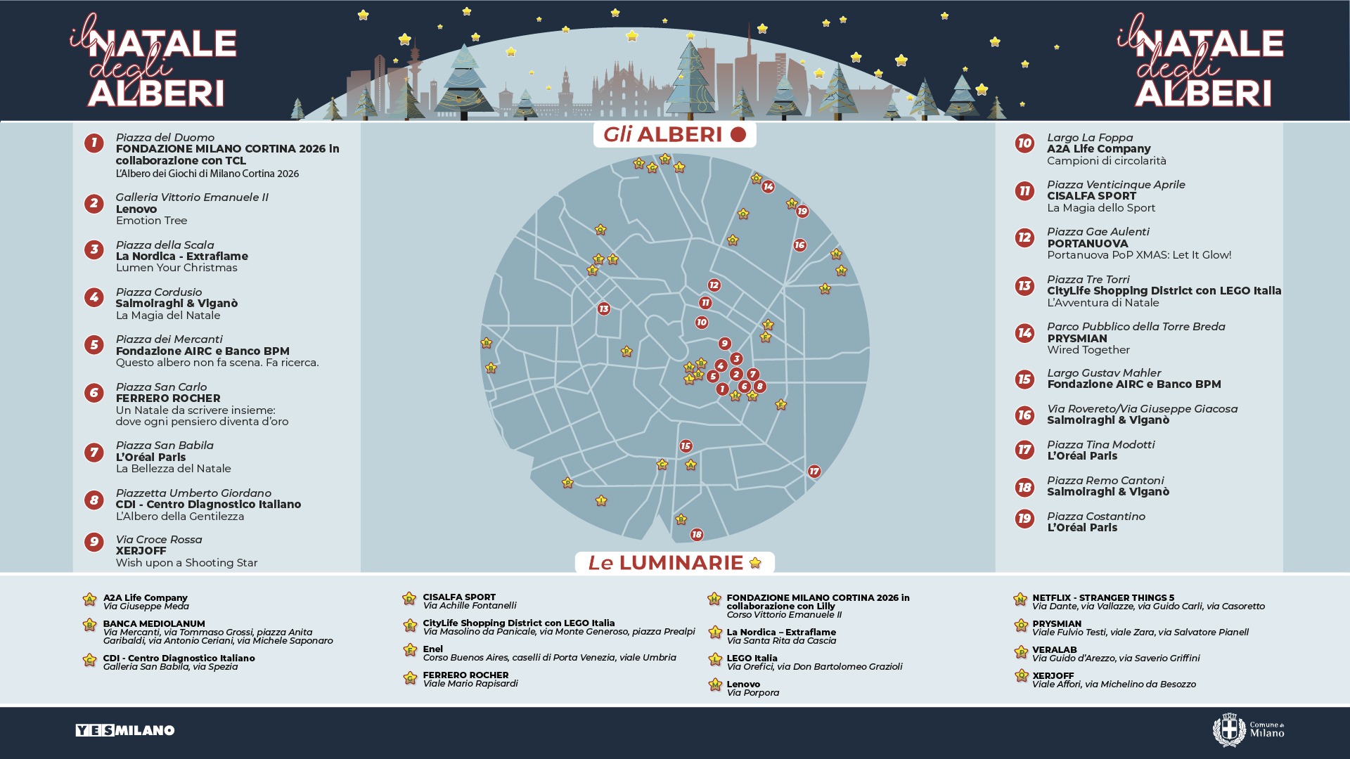 Ma l'Albero dei Giochi non è il solo ad animare le piazze e le strade di Milano fino a martedì 6 gennaio 2026: dal centro a tutti i quartieri sono oltre trenta i luoghi che splendono grazie alle proposte arrivate da tanti sponsor. Tra gli altri alberi di Natale spicca il Lenovo Emotion Tree in Galleria Vittorio Emanuele II che, insieme alla volta della galleria, si illumina di rosso, simbolo di inclusione e condivisione, grazie a Lenovo con il sostegno di Lenovo Foundation a favore di art4sport Onlus, fondata dalla campionessa paralimpica Bebe Vio Grandis. L’installazione celebra i valori di solidarietà e partecipazione promossi da sempre dall’associazione, unendo tradizione e innovazione nel cuore di Milano per rendere il Natale ancora più speciale e aperto a tutti e a tutte.