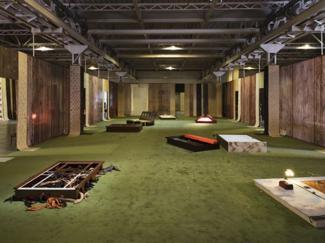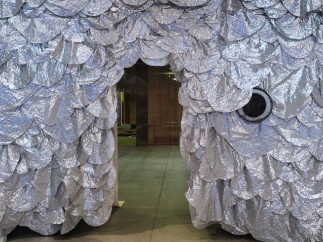 L’intervento monumentale si articola in tre ambienti distinti e interconnessi che prendono il nome di diverse parti del corpo al cui interno sono allestite opere realizzate appositamente per la mostra, accanto a installazioni e performance passate che interrogano la memoria e il rito, l’amore e la cura, la costrizione e la libertà - concetti che risuonano tanto nel corpo individuale quanto in quello collettivo. La navata destra, intitolata La guancia, evoca un ambiente morbido e ospita una riflessione sul decoro e sull’ornamento, capaci di instaurare una relazione emotiva con lo spazio abitato, in linea con il pensiero dello scrittore britannico William Morris (1834-1896) che concepiva l’ornamento come una necessità etica e sociale: per Morris, il decoro nasce dal lavoro artigianale consapevole, dall’armonia tra forma, funzione e materiale, inseparabile dalla qualità della vita quotidiana. Centrale è l’opera che dà nome alla sezione, La guancia (2026), concepita come uno spazio dedicato al riposo, alla contemplazione e al sognare ad occhi aperti inteso come gesto collettivo. Sdraio, tappeti, sculture sospese animano questo ambiente, offrendo al pubblico la possibilità di riappropriarsi della lentezza del tempo e di trasformare l’immaginazione in una forma di pensiero attivo, orientato a un futuro desiderabile fondato sulla sensibilità e sull’emozione.
