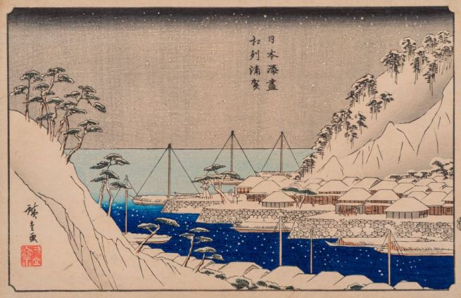 Utagawa Hiroshige, Il porto di Uraga nella provincia di Sagami sotto la neve, periodo Edo (1615-1868): 1839-42, xilografia, inchiostri policromi su carta, Roma, Muciv - Museo delle Civiltà
