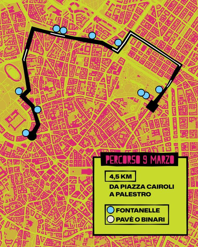 L'arrivo del corteo è a Porta Venezia. Questo è il percorso dettagliato con tutte le strade coinvolte, che vengono chiuse momentaneamente al traffico veicolare: Foro Buonaparte, viale Gadio, via Legnano, piazza Lega Lombarda, bastioni di Porta Volta, viale Crispi, piazza XXV Aprile, bastioni di Porta Nuova, viale Monte Santo, piazza della Repubblica, viale Tunisia, corso Buenos Aires, piazza Oberdan, corso Venezia, con termine del corteo all'angolo con via Palestro.