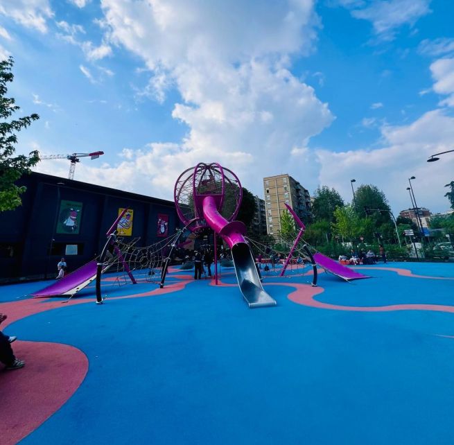 Concepita come un’installazione interattiva e ludica, che combina elementi ispirati al polpo e al ragno in una struttura polifunzionale e inclusiva, la scultura è progettata per accogliere fino a 70 bambini contemporaneamente e propone 9 diverse attività pensate per stimolare creatività, gioco e capacità motorie, in un’ottica di valorizzazione dello spazio pubblico come luogo di relazione e partecipazione.
