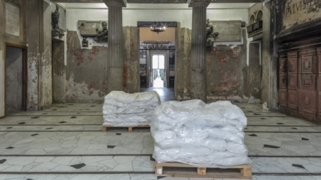 Nella versione di Londra una parte dei detriti è raccolta in un borsone da viaggio blu, simile a quello utilizzato per raccogliere il materiale delle demolizioni, ma che allo stesso tempo ricorda le borse utilizzate negli ospedali per trasportare la biancheria contaminata; nella versione parigina, oggi presentata a Milano per la prima volta, i resti del Pac vengono invece raccolti in 40 sacchi di plastica bianca stoccati su due pallet.