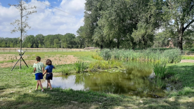 Niente aule né porte, banchi o sedie, ma 887 mila metri quadrati del Parco Agricolo Urbano del Ticinello a disposizione, tronchetti di legno e grandi panchine di pietra dove sedersi, intorno querce, alberi da frutto, un laghetto con ninfee, piccoli animali del bosco e una casetta che profuma di legno, nuova di zecca come punto d’appoggio, e 100 metri quadrati coperti da una tettoia.