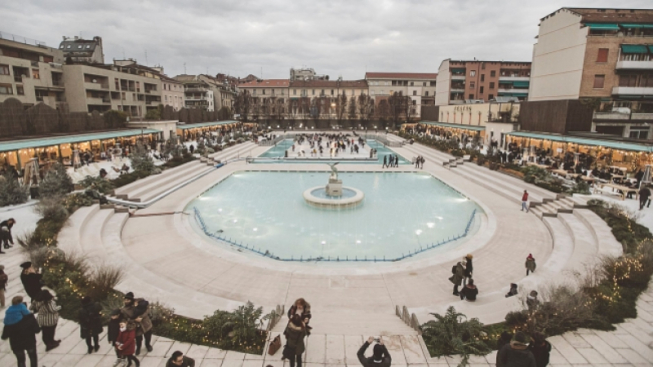 Tra i luoghi più amati dai milanesi, i Bagni Misteriosi (con ingresso da via Carlo Botta 18) ospitano anche quest'anno la suggestiva patinoire galleggiante sulla piscina, scenograficamente sistemata al centro della vasca, affiancata da un grande albero di Natale e dal dehors riscaldato con vista piscina, dove Gud Milano serve il suo speciale menu invernale di piatti caldi in versione street-food (dai mondeghili con salsa allo zafferano alla polenta di Storo con baccalà mantecato, oltre a panini e proposte veggie).