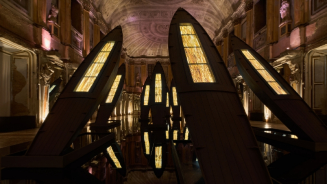 Dal 27 giugno al 10 settembre 2023 Fabrizio Plessi, tra i pionieri della videoarte, approda nella Sala delle Cariatidi di Palazzo Reale a Milano, a bordo di gigantesche barche, al cui interno scorre su degli schermi televisivi un flusso continuo di oro.