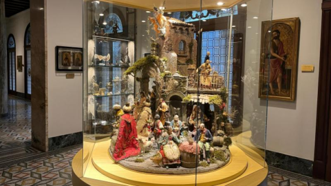 Nella sala della Medusa è esposto il presepio napoletano girevole: una classica scenografia in sughero, il tipico scoglio napoletano, ospita questa natività brulicante di personaggi. Accanto alla scena sacra dell’Adorazione dei Magi si trovano le scene di vita quotidiana come la meravigliosa osteria con la tavola apparecchiata. Sul retro un pastore dorme: è Benino, figura tipica del presepio napoletano che simboleggia colui che si è addormentato nel vecchio mondo e si risveglia nel nuovo mondo cristiano. Alcune antiche figure napoletane sono esposte anche all’inizio del precorso. Si tratta di una Sacra Famiglia, di due Mori con cavallo, questi ultimi che richiamano le figure rappresentate nel corteo dell’Adorazione dei Magi di Tiziano, e di tre Re Magi di straordinaria fattura, con i volti in terracotta finemente modellati e gli occhi in pasta di vetro. Le barbe, i capelli e persino le rughe: ogni dettaglio dona grande espressività a questi maestosi personaggi. I vestiti sono in seta cuciti a mano, ornati di passamanerie dorate e ricami in canottiglia.