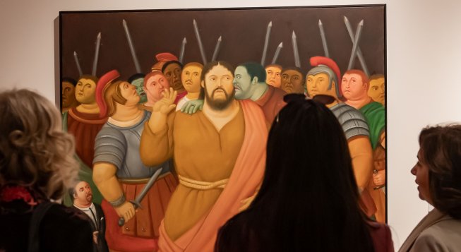 La tematica religiosa è spesso presente nel lavoro di Botero. Già nel 1969, 40 anniprima del ciclo presentato in mostra, l’artista colombiano aveva realizzato un trittico da titolo Via Crucis dove Cristo è rappresentato con gli occhi chiusi, in posizione eretta, sceso dalla croce e con le mani in posizione benedicente. Soprattutto è rappresentato avvolto da una calma serena. Il confronto con Via Crucis: la Passione di Cristo non potrebbe essere più diverso: le stazioni realizzate nel 2010 continuano a mostrare le forme opulente e i colori delicati, cifra di Botero, ma al tempo stesso metto in scena il dramma della morte di Cristo, che viene rappresentato in modo indifeso e vulnerabile, suscitando una pena indicibile nel vederlo vilipeso e oltraggiato, ferito e crocifisso.