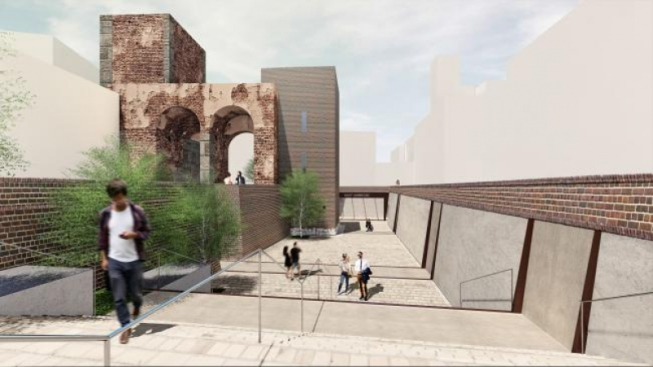 Il progetto di suolo del nuovo spazio aperto ipogeo parte da un’attenta analisi della stratificazione storica e si ripropone di ricostruire idealmente le spazialità originarie del sistema difensivo della Pusterla basandosi sulle tracce esistenti, soluzione studiata in concerto con la Soprintendenza. Anche i materiali utilizzati in questo progetto si rifanno alla tradizione costruttiva milanese, la pietra, accostandoli a materiali contemporanei, il calcestruzzo spazzolato e il metallo, il cui disegno traccia a terra e sulla parete nord le linee del vecchio sistema difensivo facendolo riemergere filologicamente.